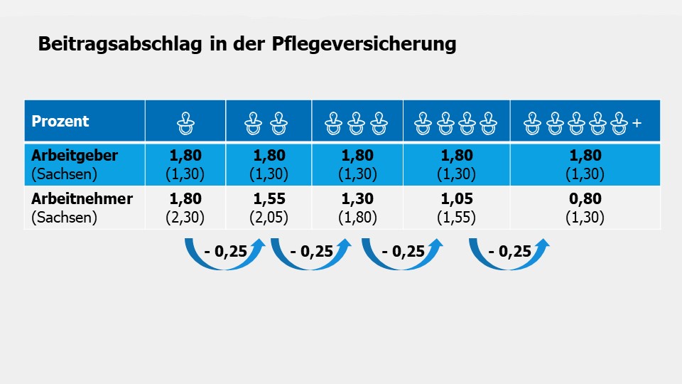 Für Arbeitnehmer mit Elterneigenschaft reduziert sich der Beitragssatz zur Pflegeversicherung für jedes berücksichtigungsfähige Kind ab dem zweiten Kind bis zum fünften Kind um jeweils einen Beitragsabschlag in Höhe von 0,25 Beitragssatzpunkten:
