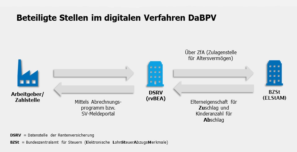 Das Bundeszentralamt für Steuern (BZSt), der Spitzenverband Bund der Pflegekassen und die Deutsche Rentenversicherung Bund haben die Gemeinsamen Grundsätze vom 29. August 2024 aufgestellt. Danach gilt (Ziffer 1.2): „Die Teilnahme am DaBPV ist für alle beitragsabführenden Stellen, die zur Berücksichtigung von Zu- und Abschlägen in der sozialen Pflegeversicherung verpflichtet sind, obligatorisch.“ Die Gemeinsamen Grundsätze (sowie nach deren Finalisierung später auch die von der ZfA aufzustellende Verfahrensbeschreibung) können wertvolle Unterstützung beim Start in das neue Verfahren leisten.
