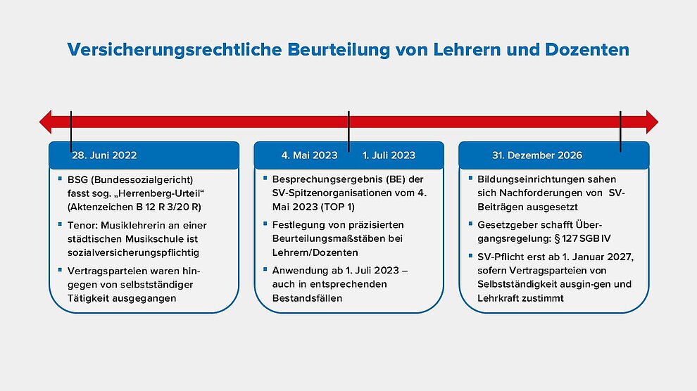 Nach der Übergangsregelung in § 127 SGB IV soll eine Feststellung des Sozialversicherungsstatus von Lehrkräften als abhängig beschäftigt durch die Sozialversicherungsträger bis zum 31. Dezember 2026 ohne Wirkung bleiben; d. h. die Versicherungspflicht soll erst ab dem 1. Januar 2027 beginnen. Dies gilt immer dann, wenn