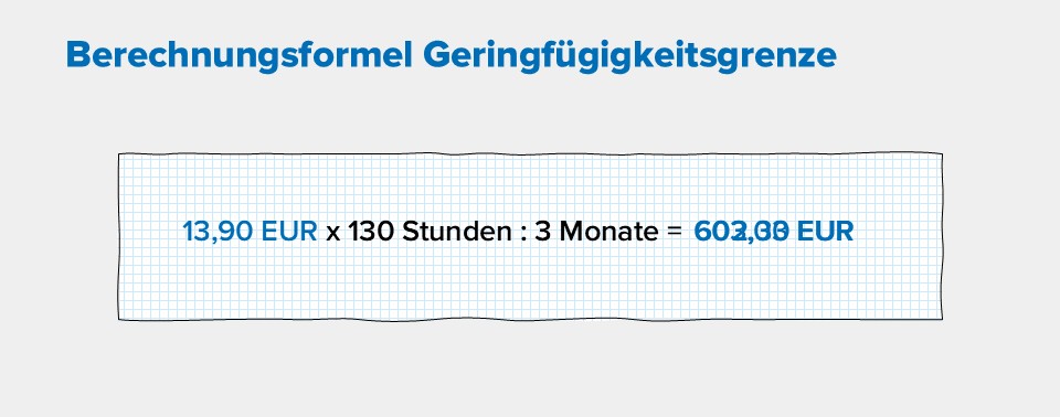 Berechnung: Als dynamische Obergrenze für einen Minijob orientiert sich die Geringfügigkeitsgrenze an einer Wochenarbeitszeit von 10 Stunden zum gesetzlichen Mindestlohn. Der gesetzliche Mindest-Stundenlohn wird mit 130 Stunden (13 Wochen pro Quartal multipliziert mit 10 Stunden) vervielfacht, durch 3 Monate geteilt und der sich daraus ergebende Betrag wird auf volle Euro aufgerundet. Eine wöchentliche Arbeitszeit von 10 Stunden entspricht einer Arbeitszeit von 43 Stunden und 20 Minuten im Monat.